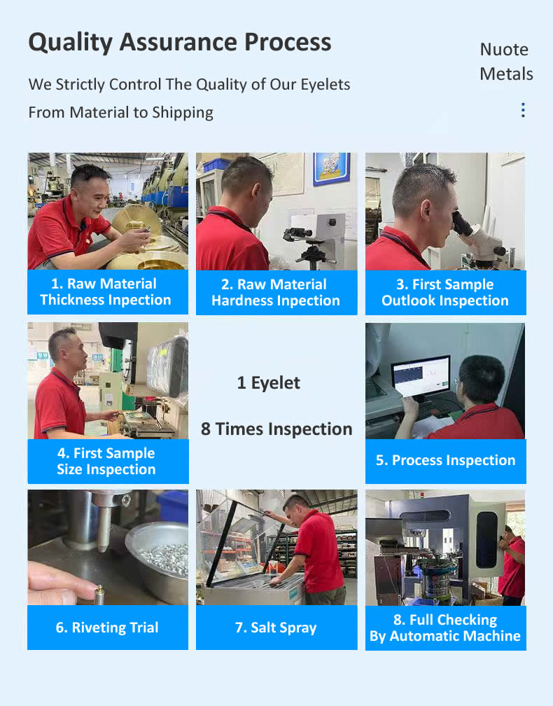 Małe mosiężne oczka służą do wzmacniania otworów w lekkich materiałach. Ludzie wkładają je do tkaniny, skóry lub papieru, aby zapobiec rozdarciu dziury. Ponieważ są z mosiądzu, małe mosiężne oczka mają ładny złoty kolor, który nie blaknie. Można je również łatwo ustawić — wystarczy nacisnąć ręcznie lub małą maszyną, aby wcisnąć je na miejsce. Po zainstalowaniu małe mosiężne oczka pozostają na swoim miejscu i nie poluzowują się. Niewielki rozmiar sprawia, że idealnie nadają się do delikatnych przedmiotów, w których większe oczko wyglądałoby nie na miejscu.